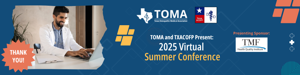 2025 Virtual Summer ConferenceThank you for being part of the 2025 Virtual Summer Conference and helping make our first fully virtual event a success! Your enthusiasm and commitment to new ways of learning continue to strengthen our association and the Texas osteopathic community as a whole. TOMA is already looking ahead to the 70th Annual MidWinter Conference, happening Feb. 27–March 1, 2026, in Conroe. Save the date and plan to join us in person for engaging sessions, hands-on learning and opportunities to reconnect with osteopathic leaders and colleagues statewide. More details coming soon! Presenting SponsorTOMA is proud to welcome TMF Health Quality Institute as the exclusive Presenting Sponsor for the inaugural Virtual Summer Conference. Their continued support powers a dynamic, on-demand CME experience for Texas osteopathic physicians. |